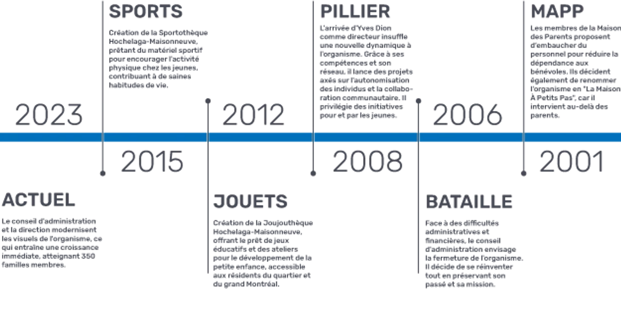 Depuis près de 50 ans, La Maison À Petits Pas est un organisme communautaire engagé auprès des familles du Grand Montréal, et plus particulièrement du quartier Hochelaga-Maisonneuve. Fondée sous l’impulsion de M. Gaston Gauthier et d’un groupe de professionnels de la santé et de l’éducation, l’organisme a vu le jour en 1976 avec une vision commune : offrir un soutien aux parents et renforcer la solidarité entre citoyens.